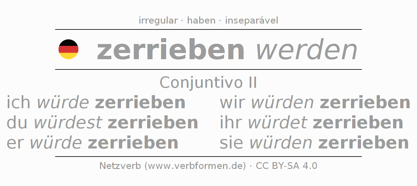 A conjugação do verbo zerreiben no Voz Passiva Conjuntivo Pretérito Conjuntivo é: ich würde zerrieben, du würdest zerrieben, er würde zerrieben, wir würden zerrieben, ihr würdet zerrieben, sie würden zerrieben.A formação dessas formas segue determinadas regras gramaticais. Os requisitos para a conjugação do verbo como forma verbal simples no zerreiben do Conjuntivo II. Comentários ☆