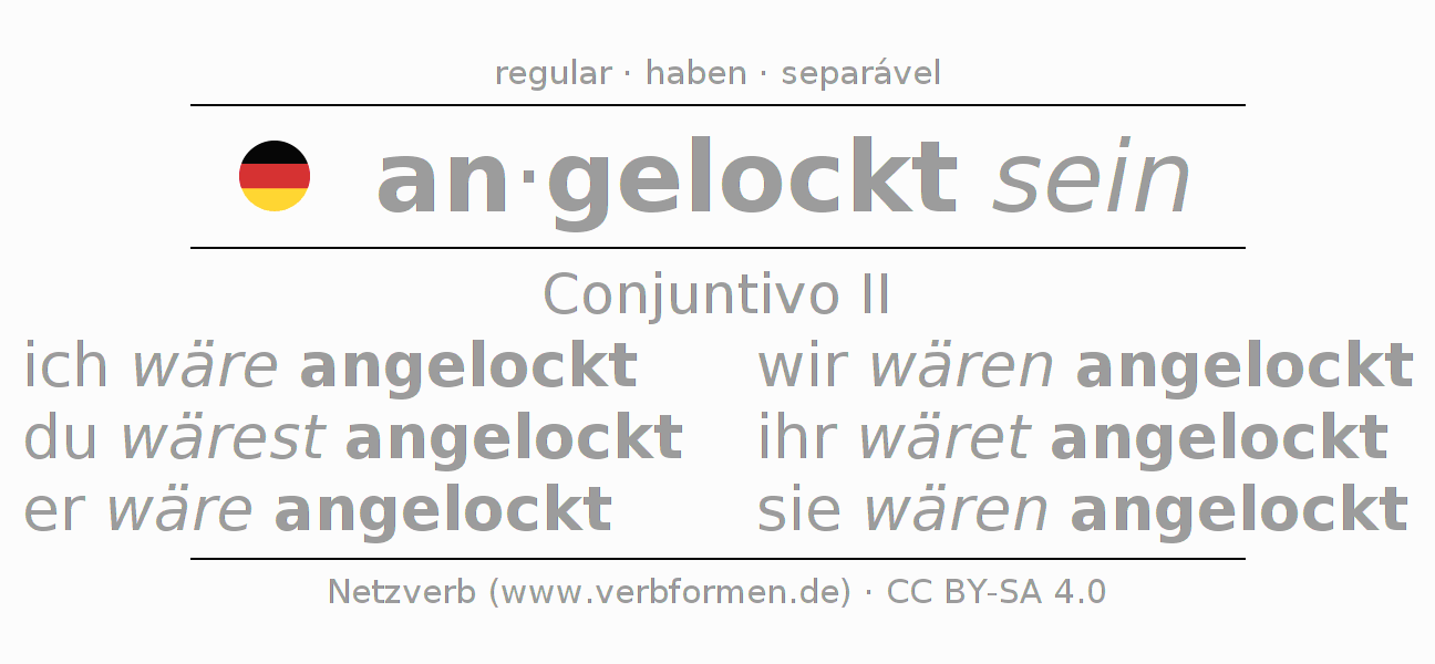 A conjugação do verbo anlocken no Estado passivo Conjuntivo Pretérito Conjuntivo é: ich wäre angelockt, du wärest angelockt, er wäre angelockt, wir wären angelockt, ihr wäret angelockt, sie wären angelockt.A formação dessas formas segue determinadas regras gramaticais. Os requisitos para a conjugação do verbo como forma verbal simples no anlocken do Conjuntivo II. Comentários ☆