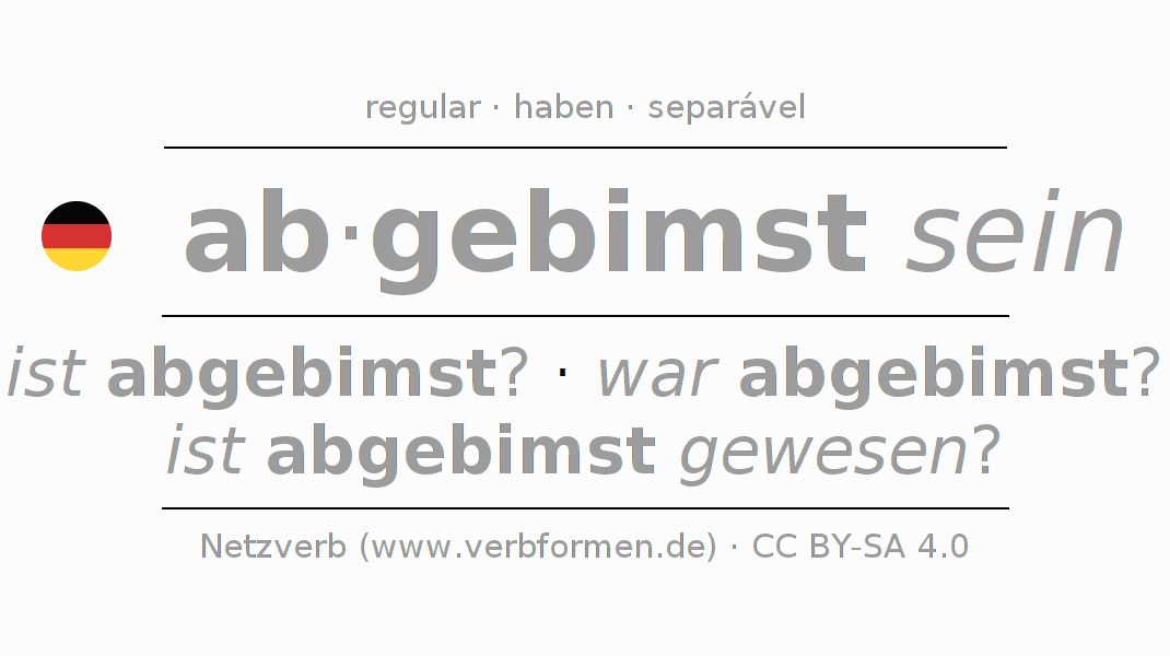 A conjugação do verbo abbimsen no Estado passivo Conjuntivo Pretérito Conjuntivo é: wäre ich abgebimst?, wärest du abgebimst?, wäre er abgebimst?, wären wir abgebimst?, wäret ihr abgebimst?, wären sie abgebimst?.A formação dessas formas segue determinadas regras gramaticais. Os requisitos para a conjugação do verbo como forma verbal simples no abbimsen do Conjuntivo II. Comentários ☆