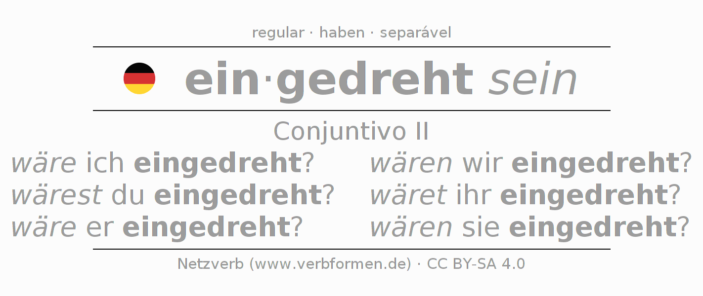 A conjugação do verbo eindrehen no Estado passivo Conjuntivo Pretérito Conjuntivo é: wäre ich eingedreht?, wärest du eingedreht?, wäre er eingedreht?, wären wir eingedreht?, wäret ihr eingedreht?, wären sie eingedreht?.A formação dessas formas segue determinadas regras gramaticais. Os requisitos para a conjugação do verbo como forma verbal simples no eindrehen do Conjuntivo II. Comentários ☆