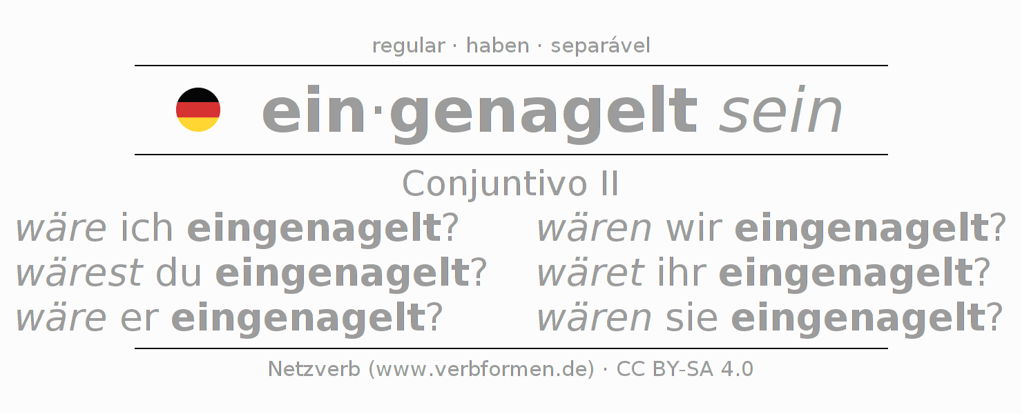 A conjugação do verbo einnageln no Estado passivo Conjuntivo Pretérito Conjuntivo é: wäre ich eingenagelt?, wärest du eingenagelt?, wäre er eingenagelt?, wären wir eingenagelt?, wäret ihr eingenagelt?, wären sie eingenagelt?.A formação dessas formas segue determinadas regras gramaticais. Os requisitos para a conjugação do verbo como forma verbal simples no einnageln do Conjuntivo II. Comentários ☆