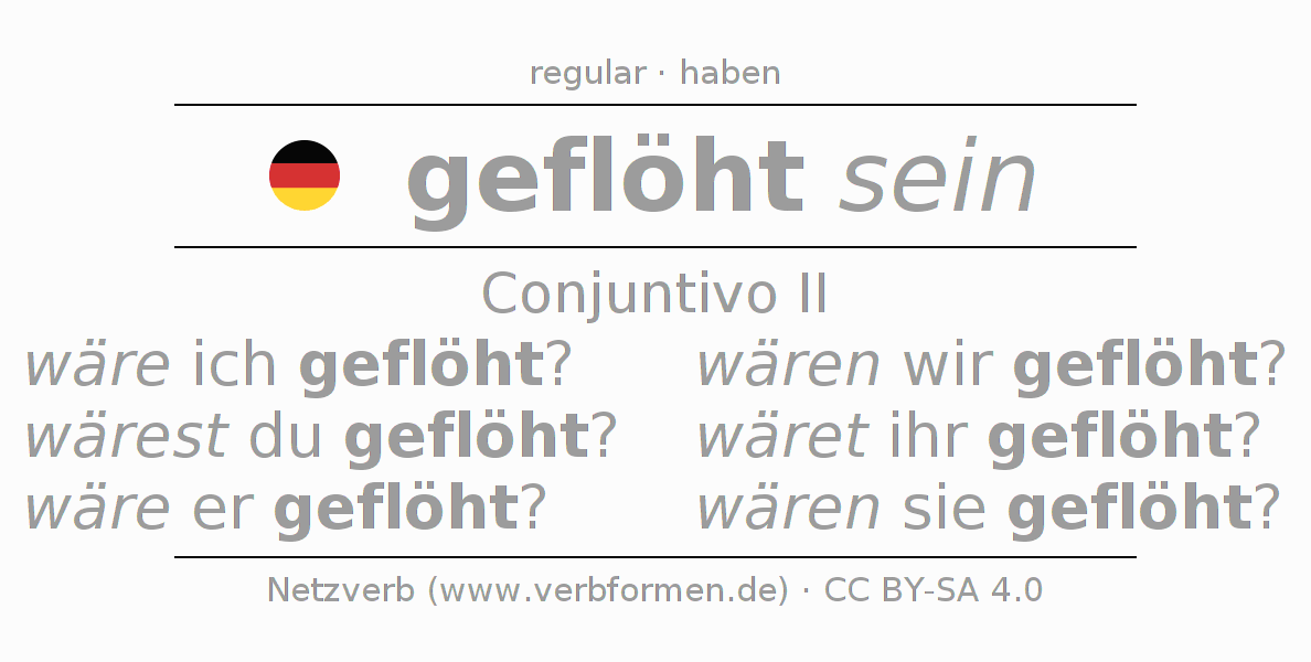 A conjugação do verbo flöhen no Estado passivo Conjuntivo Pretérito Conjuntivo é: wäre ich geflöht?, wärest du geflöht?, wäre er geflöht?, wären wir geflöht?, wäret ihr geflöht?, wären sie geflöht?.A formação dessas formas segue determinadas regras gramaticais. Os requisitos para a conjugação do verbo como forma verbal simples no flöhen do Conjuntivo II. Comentários ☆