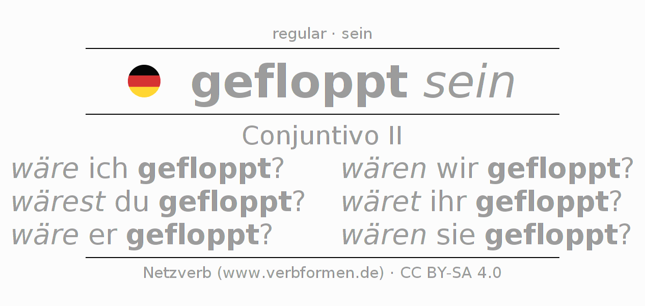 A conjugação do verbo floppen no Estado passivo Conjuntivo Pretérito Conjuntivo é: wäre ich gefloppt?, wärest du gefloppt?, wäre er gefloppt?, wären wir gefloppt?, wäret ihr gefloppt?, wären sie gefloppt?.A formação dessas formas segue determinadas regras gramaticais. Os requisitos para a conjugação do verbo como forma verbal simples no floppen do Conjuntivo II. Comentários ☆