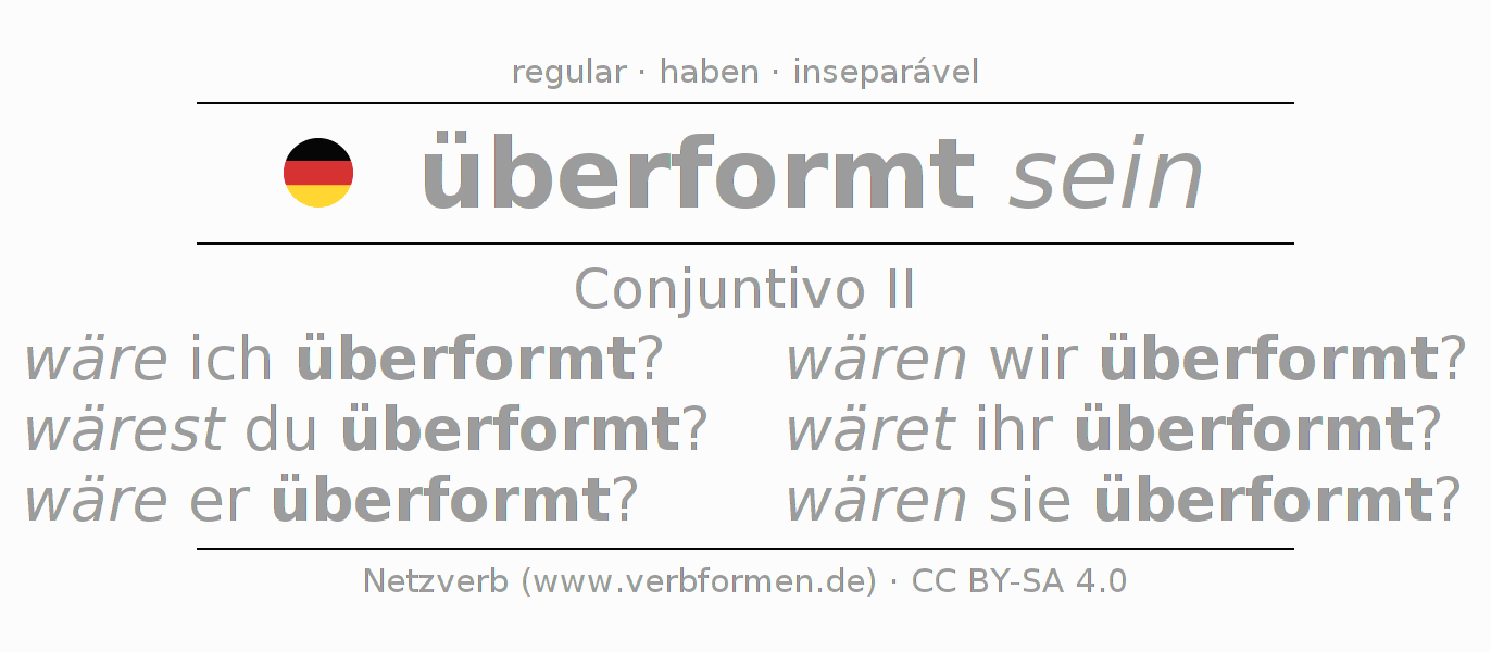A conjugação do verbo überformen no Estado passivo Conjuntivo Pretérito Conjuntivo é: wäre ich überformt?, wärest du überformt?, wäre er überformt?, wären wir überformt?, wäret ihr überformt?, wären sie überformt?.A formação dessas formas segue determinadas regras gramaticais. Os requisitos para a conjugação do verbo como forma verbal simples no überformen do Conjuntivo II. Comentários ☆