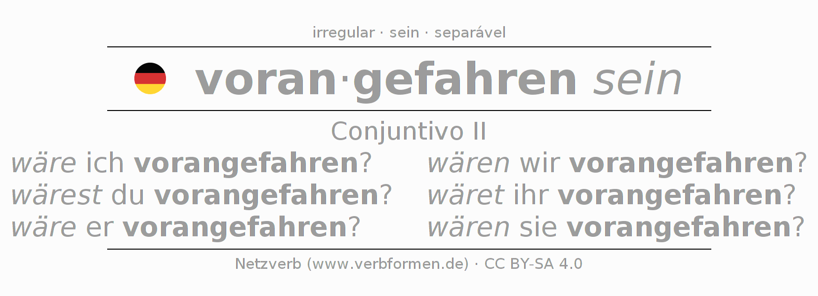 A conjugação do verbo voranfahren no Estado passivo Conjuntivo Pretérito Conjuntivo é: wäre ich vorangefahren?, wärest du vorangefahren?, wäre er vorangefahren?, wären wir vorangefahren?, wäret ihr vorangefahren?, wären sie vorangefahren?.A formação dessas formas segue determinadas regras gramaticais. Os requisitos para a conjugação do verbo como forma verbal simples no voranfahren do Conjuntivo II. Comentários ☆