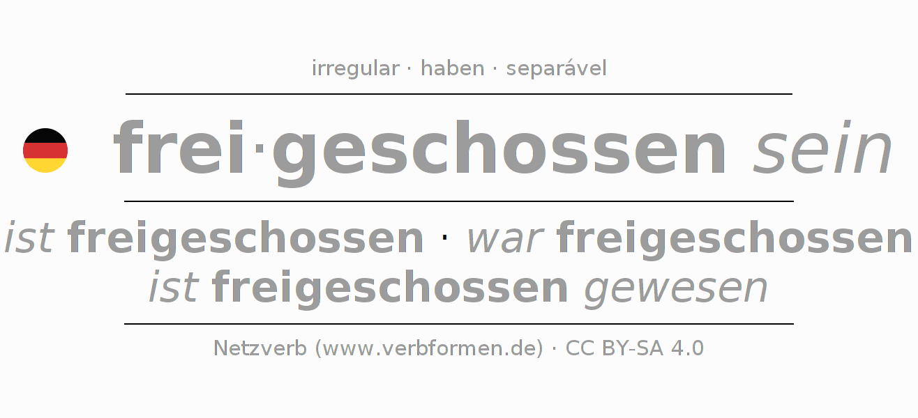 A conjugação do verbo freischießen no Estado passivo Conjuntivo Pretérito Conjuntivo é: ich wäre freigeschossen, du wärest freigeschossen, er wäre freigeschossen, wir wären freigeschossen, ihr wäret freigeschossen, sie wären freigeschossen.A formação dessas formas segue determinadas regras gramaticais. Os requisitos para a conjugação do verbo como forma verbal simples no freischießen do Conjuntivo II. Comentários ☆
