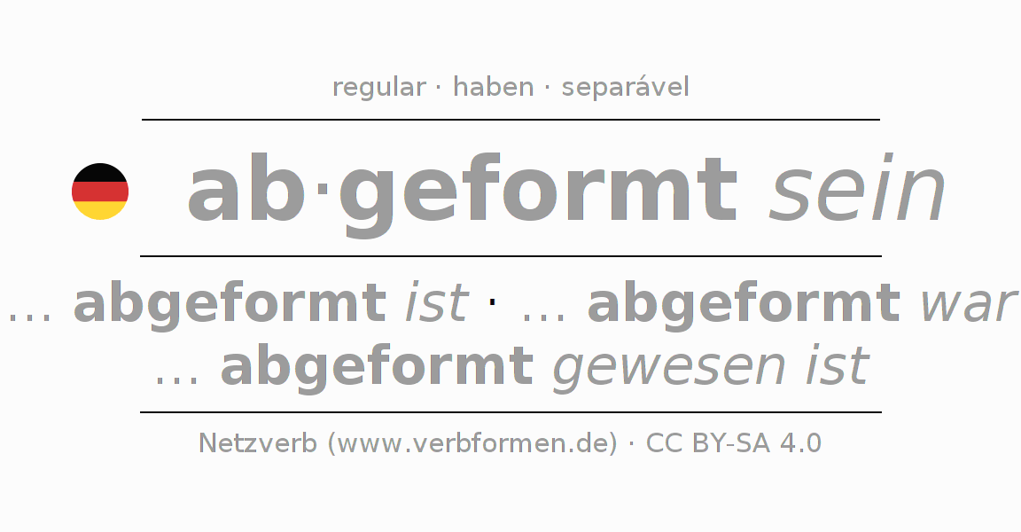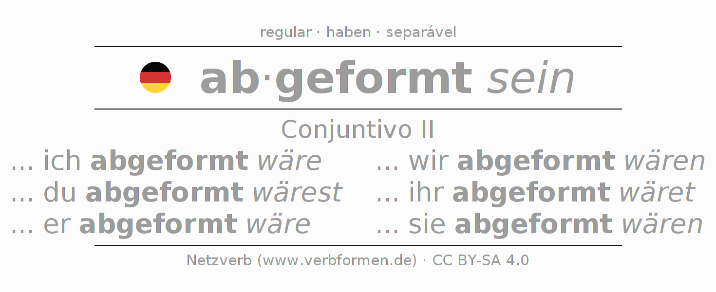 A conjugação do verbo abformen no Estado passivo Conjuntivo Pretérito Conjuntivo é: ... ich abgeformt wäre, ... du abgeformt wärest, ... er abgeformt wäre, ... wir abgeformt wären, ... ihr abgeformt wäret, ... sie abgeformt wären.A formação dessas formas segue determinadas regras gramaticais. Os requisitos para a conjugação do verbo como forma verbal simples no abformen do Conjuntivo II. Comentários ☆
