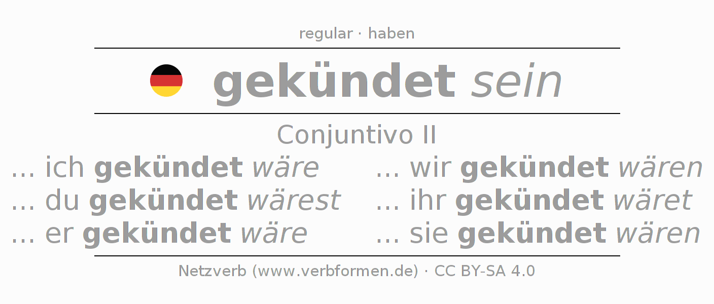 A conjugação do verbo künden no Estado passivo Conjuntivo Pretérito Conjuntivo é: ... ich gekündet wäre, ... du gekündet wärest, ... er gekündet wäre, ... wir gekündet wären, ... ihr gekündet wäret, ... sie gekündet wären.A formação dessas formas segue determinadas regras gramaticais. Os requisitos para a conjugação do verbo como forma verbal simples no künden do Conjuntivo II. Comentários ☆