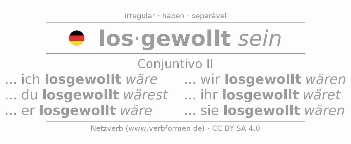 A conjugação do verbo loswollen no Estado passivo Conjuntivo Pretérito Conjuntivo é: ... ich losgewollt wäre, ... du losgewollt wärest, ... er losgewollt wäre, ... wir losgewollt wären, ... ihr losgewollt wäret, ... sie losgewollt wären.A formação dessas formas segue determinadas regras gramaticais. Os requisitos para a conjugação do verbo como forma verbal simples no loswollen do Conjuntivo II. Comentários ☆