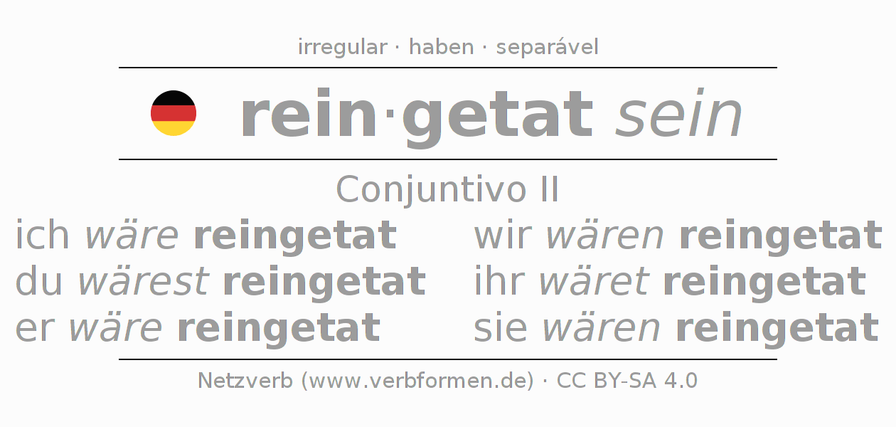 A conjugação do verbo reintun no Estado passivo Conjuntivo Pretérito Conjuntivo é: ich wäre reingetat, du wärest reingetat, er wäre reingetat, wir wären reingetat, ihr wäret reingetat, sie wären reingetat.A formação dessas formas segue determinadas regras gramaticais. Os requisitos para a conjugação do verbo como forma verbal simples no reintun do Conjuntivo II. Comentários ☆