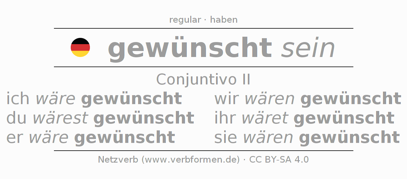 A conjugação do verbo wünschen no Estado passivo Conjuntivo Pretérito Conjuntivo é: ich wäre gewünscht, du wärest gewünscht, er wäre gewünscht, wir wären gewünscht, ihr wäret gewünscht, sie wären gewünscht.A formação dessas formas segue determinadas regras gramaticais. Os requisitos para a conjugação do verbo como forma verbal simples no wünschen do Conjuntivo II. Comentários ☆