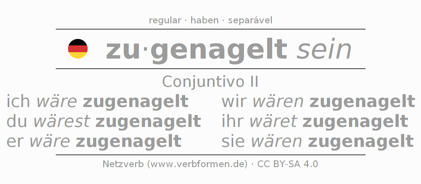 A conjugação do verbo zunageln no Estado passivo Conjuntivo Pretérito Conjuntivo é: ich wäre zugenagelt, du wärest zugenagelt, er wäre zugenagelt, wir wären zugenagelt, ihr wäret zugenagelt, sie wären zugenagelt.A formação dessas formas segue determinadas regras gramaticais. Os requisitos para a conjugação do verbo como forma verbal simples no zunageln do Conjuntivo II. Comentários ☆
