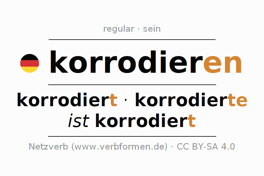 A conjugação do verbo korrodieren (corroer, corroer-se) é regular. As formas mais comuns são korrodiert, korrodierte e ist korrodiert. O verbo auxilar para korrodieren é "sein". No entanto, há formas verbais com o verbo auxiliar " haben".