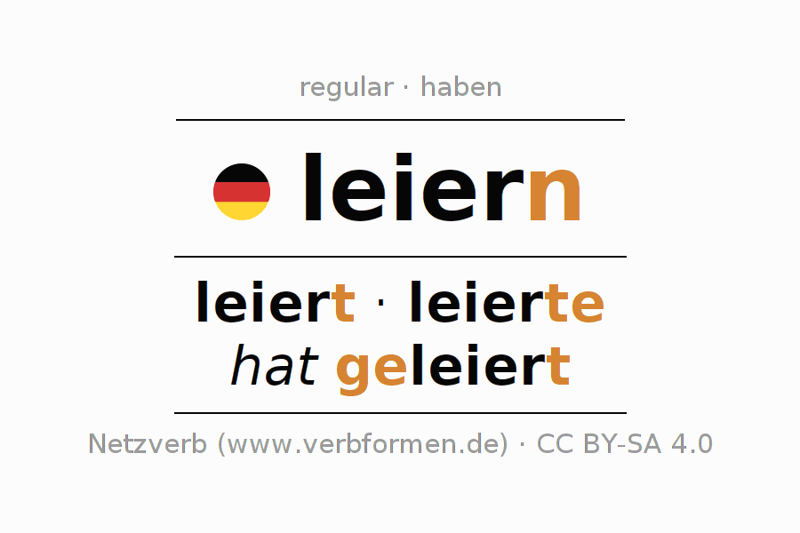 A conjugação do verbo leiern é apresentada online assim como a Tabela de Verbo com todas as formas verbais no singular e no plural, e em todas as pessoas (1ª pessoa, 2ª pessoa, 3ª pessoa) A flexão do verbo leiern é portanto, uma ajuda para os trabalhos de casa, testes, exames, aulas de alemão, para o estudo do alemão como língua estrangeira, como segunda língua e também na formação de adultos. Especialmente no aprendizado do alemão é importante a conjugação correta do verbo com as respectivamente formas flexionadas corretamente (leiert - leierte - hat geleiert). Mais informações podem ser encontradas no Wiktionary leiern e no Duden leiern.
