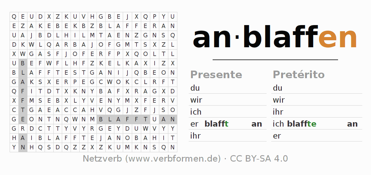 Caça-palavras para todas as formas do verbo anblaffen