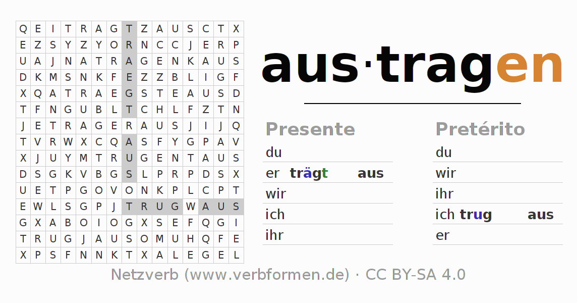 As planilhas são geralmente usadas no ensino para a Conjugação do verbo austragen. Os materiais podem ser utilizados como Recursos Educacionais Abertos (OER) em exercícios, jogos e tarefas (CC BY-SA 4.0). Existem diferentes tipos de tarefas disponíveis para o verbo austragen. Há uma variedade de execícios com uma visão geral e completa da conjugação como por exemplo, caça-palavras e jogos que requerem um aprendizado em conjunto. Todo o material educacional está disponível gratuitamente para download como PDF, como imagem e através uma versão interativa do navegador. Além das tarefas, inúmeros exemplos do verbo austragen também auxiliam na utilização do verbo.