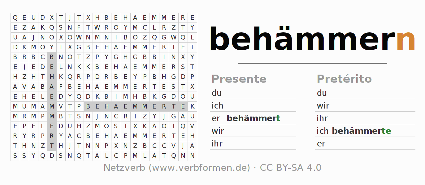 Com o caça-palavras aprende-se de uma forma desafiadora a conjugação do verbo behämmern.
