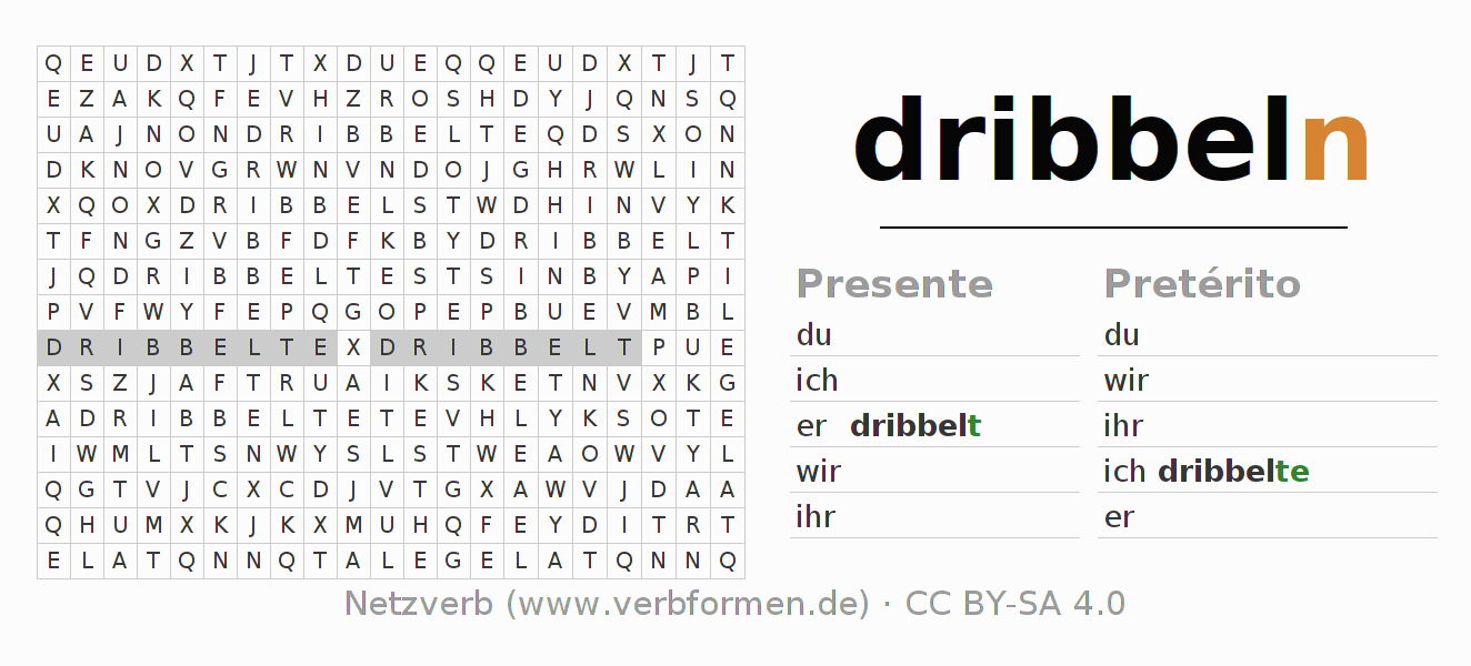 Com o caça-palavras aprende-se de uma forma desafiadora a conjugação do verbo dribbeln.