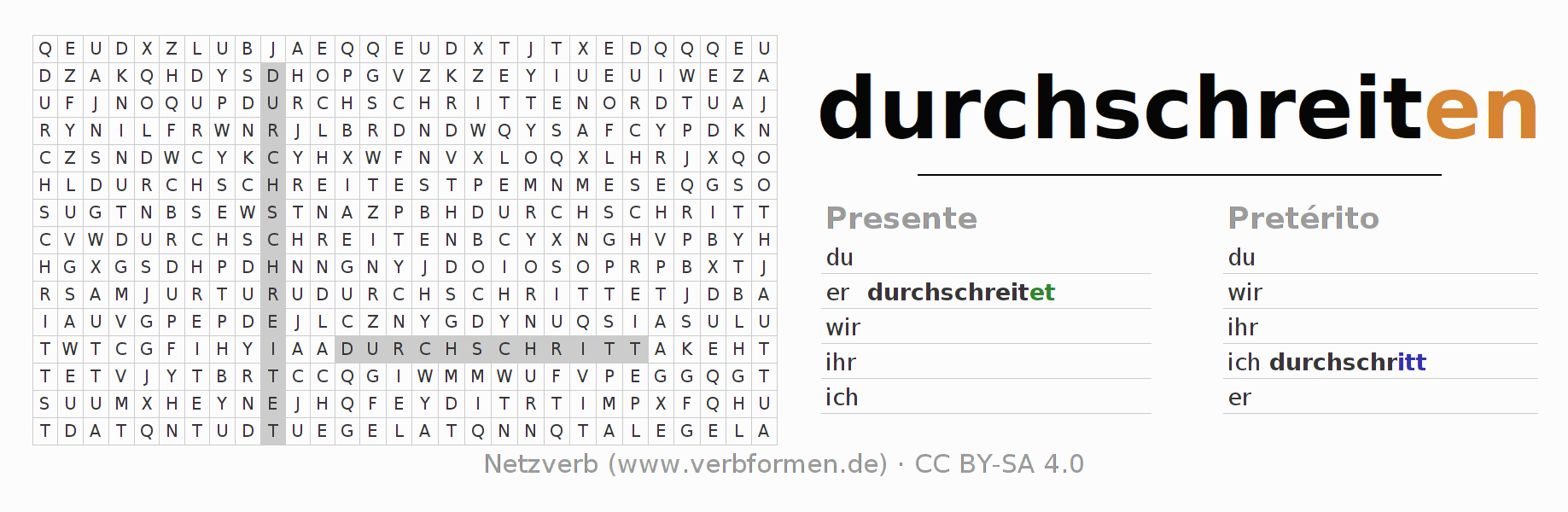 As planilhas são geralmente usadas no ensino para a Conjugação do verbo durchschreiten. Os materiais podem ser utilizados como Recursos Educacionais Abertos (OER) em exercícios, jogos e tarefas (CC BY-SA 4.0). Existem diferentes tipos de tarefas disponíveis para o verbo durchschreiten. Há uma variedade de execícios com uma visão geral e completa da conjugação como por exemplo, caça-palavras e jogos que requerem um aprendizado em conjunto. Todo o material educacional está disponível gratuitamente para download como PDF, como imagem e através uma versão interativa do navegador. Além das tarefas, inúmeros exemplos do verbo durchschreiten também auxiliam na utilização do verbo.