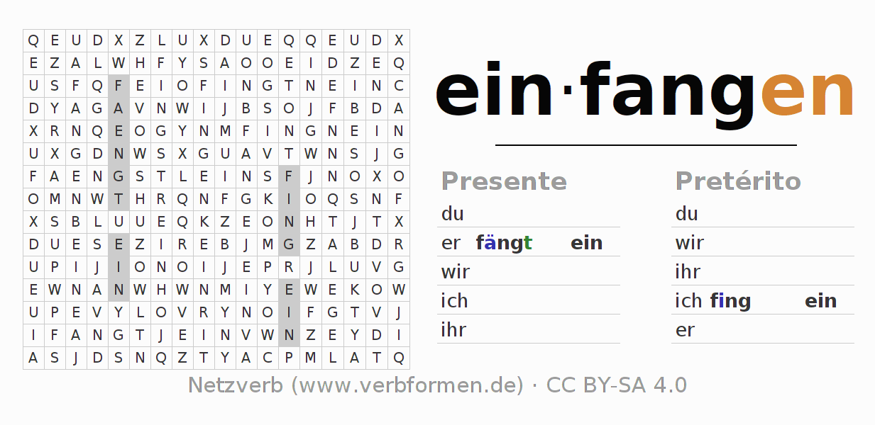 Com o caça-palavras aprende-se de uma forma desafiadora a conjugação do verbo einfangen.