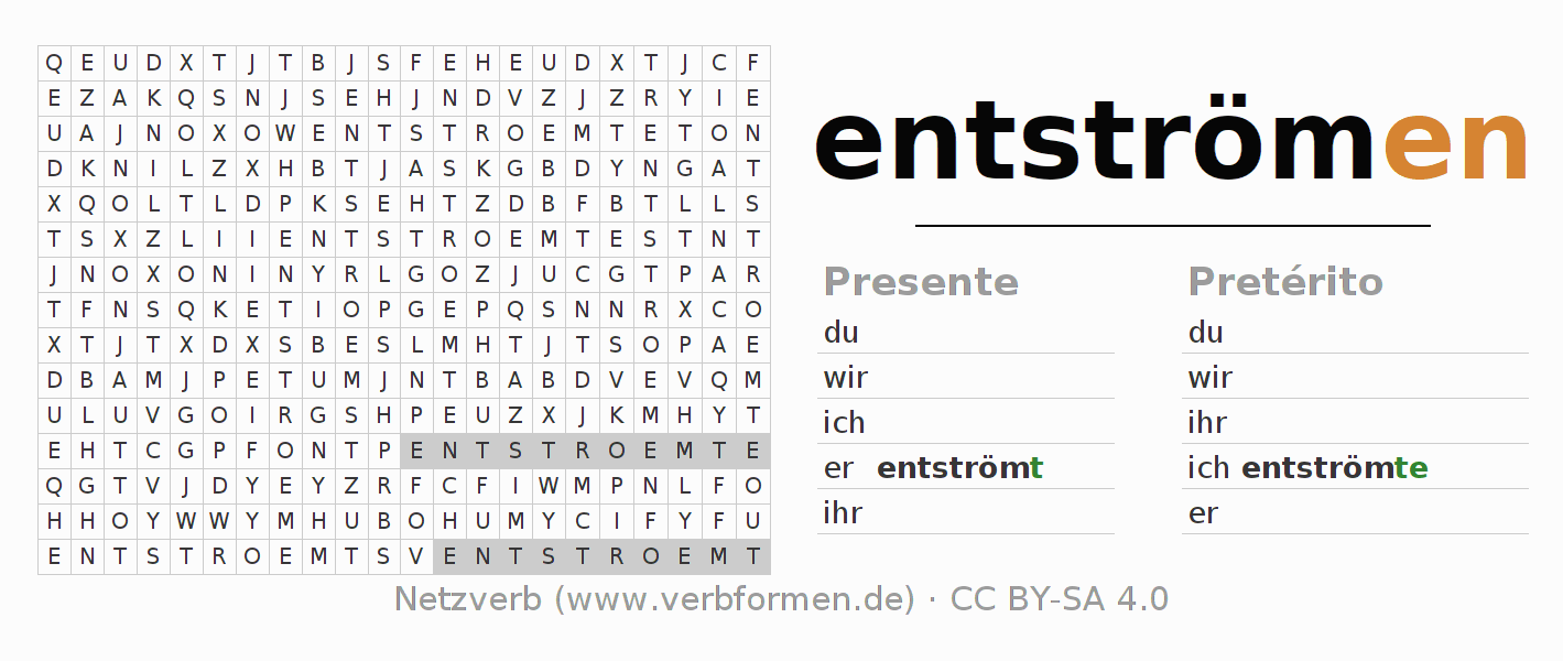 Com o caça-palavras aprende-se de uma forma desafiadora a conjugação do verbo entströmen.