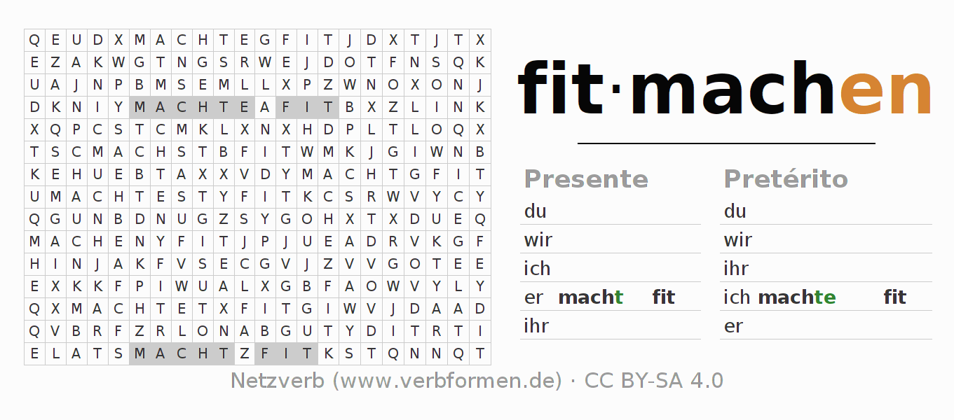 Com o caça-palavras aprende-se de uma forma desafiadora a conjugação do verbo fitmachen.