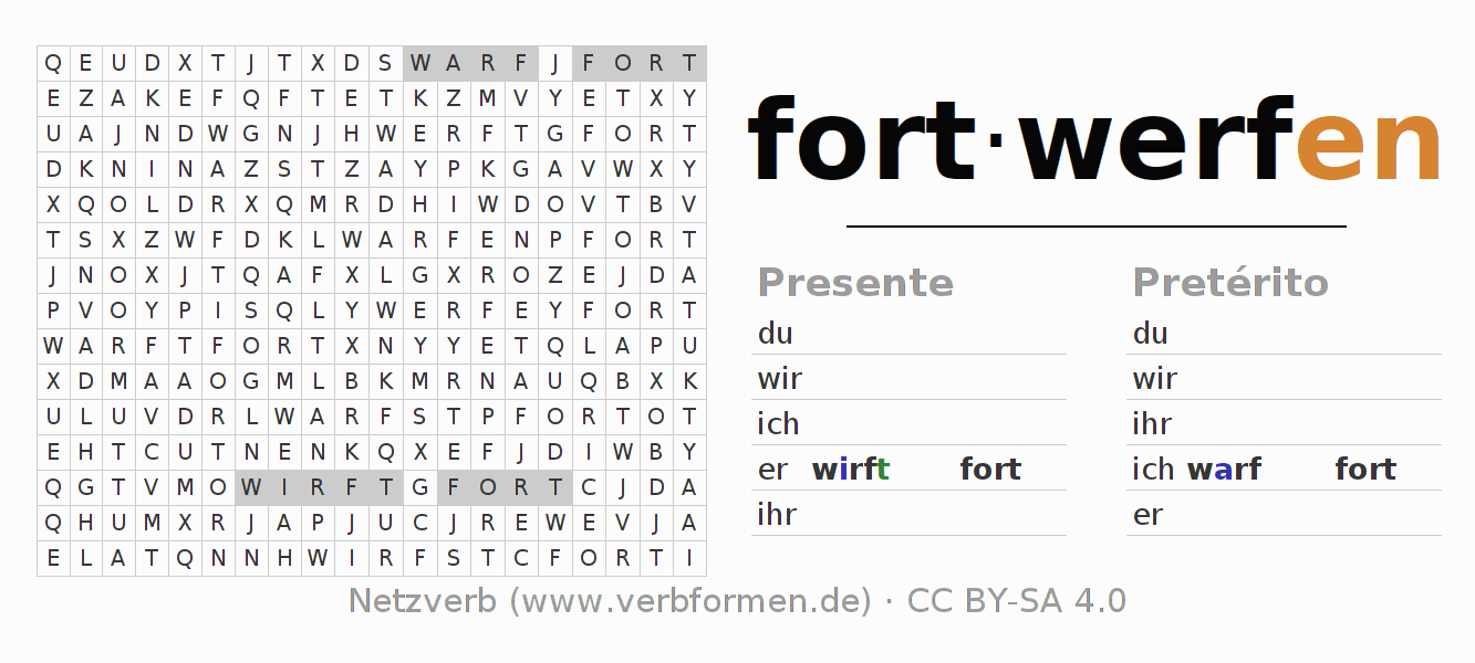 Caça-palavras para todas as formas do verbo fortwerfen