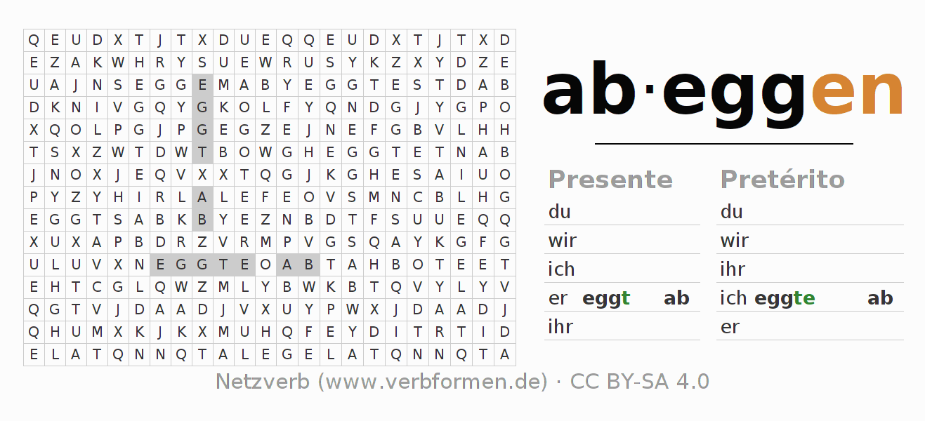 Com o caça-palavras aprende-se de uma forma desafiadora a conjugação do verbo abeggen.