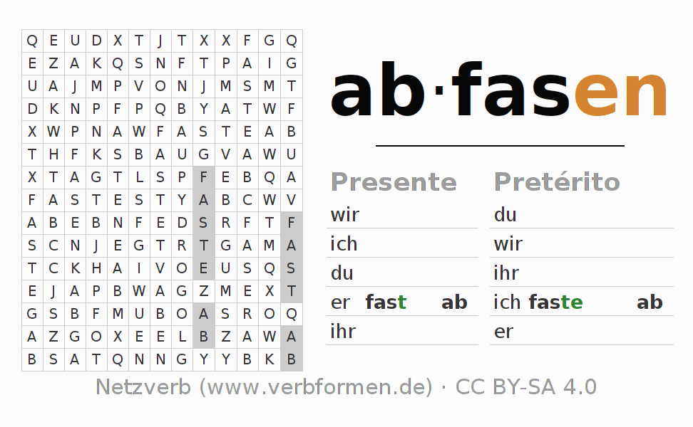 Com o caça-palavras aprende-se de uma forma desafiadora a conjugação do verbo abfasen.