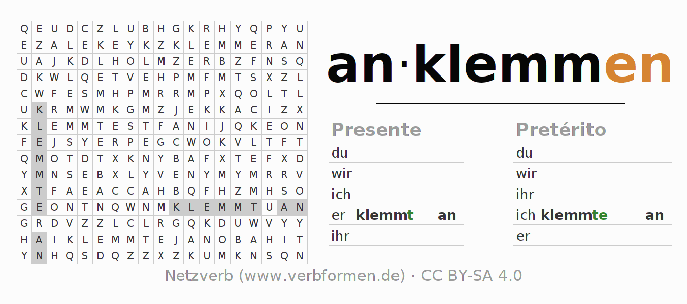Com o caça-palavras aprende-se de uma forma desafiadora a conjugação do verbo anklemmen.