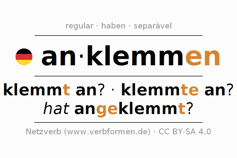 Flashcards, cartões de aprendizagem para todas as formas do verbo anklemmen