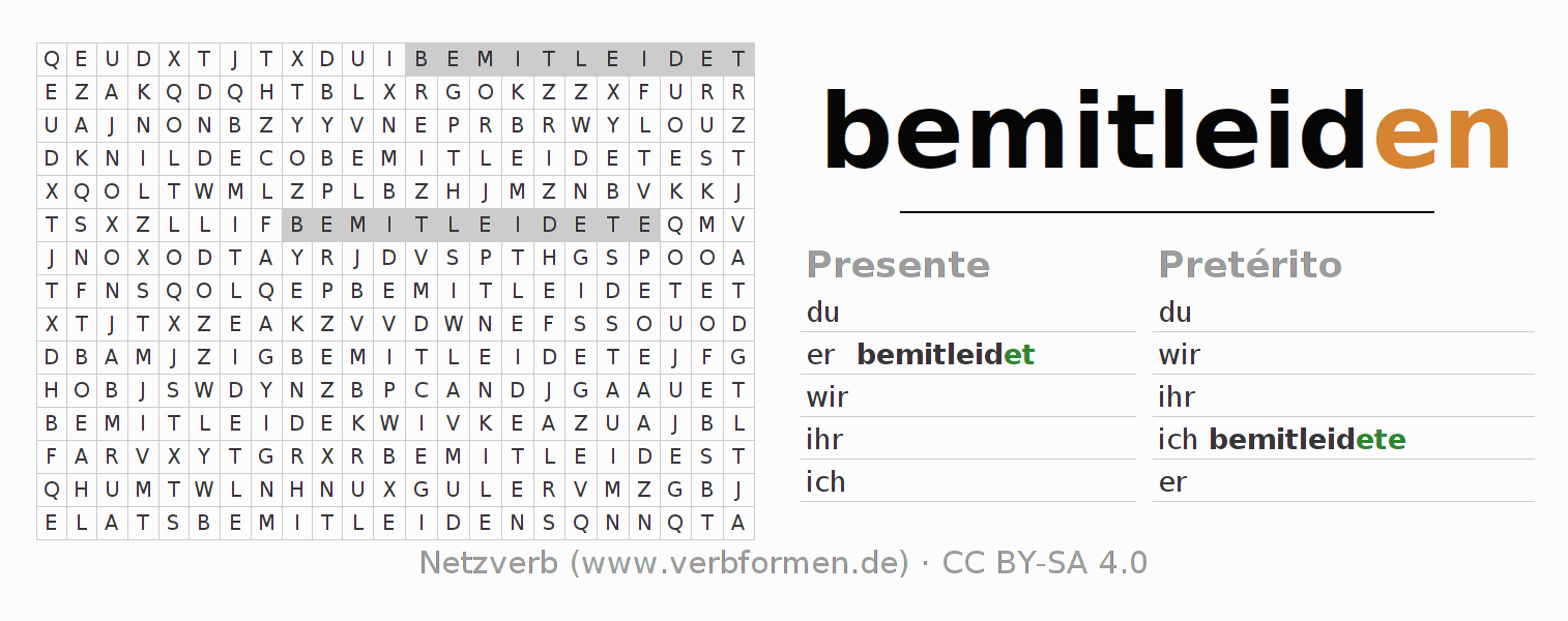 Com o caça-palavras aprende-se de uma forma desafiadora a conjugação do verbo bemitleiden.