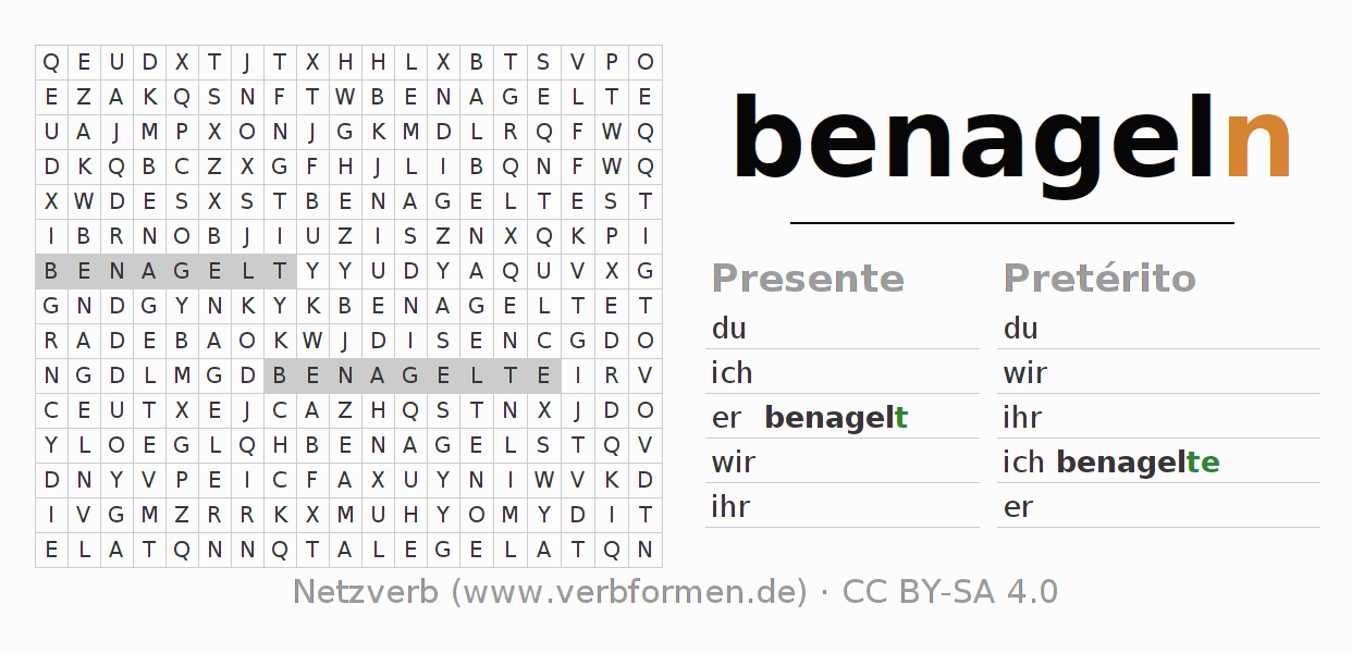 Com o caça-palavras aprende-se de uma forma desafiadora a conjugação do verbo benageln.