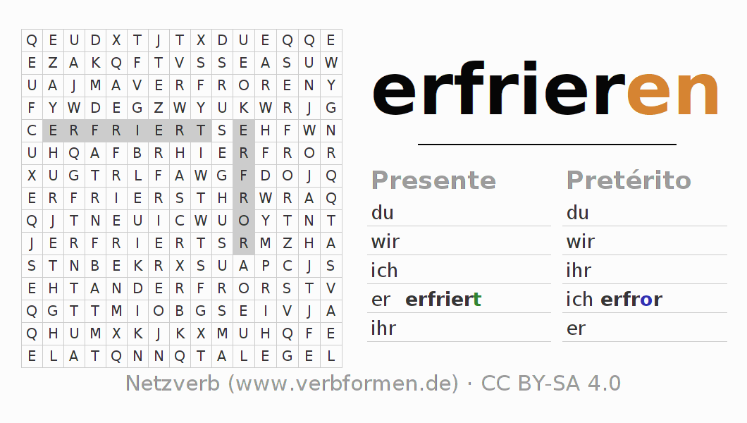 Com o caça-palavras aprende-se de uma forma desafiadora a conjugação do verbo erfrieren.