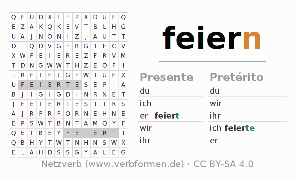 As planilhas são geralmente usadas no ensino para a Conjugação do verbo feiern. Os materiais podem ser utilizados como Recursos Educacionais Abertos (OER) em exercícios, jogos e tarefas (CC BY-SA 4.0). Existem diferentes tipos de tarefas disponíveis para o verbo feiern. Há uma variedade de execícios com uma visão geral e completa da conjugação como por exemplo, caça-palavras e jogos que requerem um aprendizado em conjunto. Todo o material educacional está disponível gratuitamente para download como PDF, como imagem e através uma versão interativa do navegador. Além das tarefas, inúmeros exemplos do verbo feiern também auxiliam na utilização do verbo.