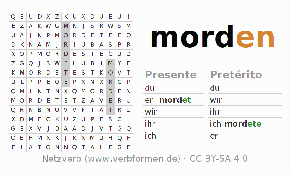 As planilhas são geralmente usadas no ensino para a Conjugação do verbo morden. Os materiais podem ser utilizados como Recursos Educacionais Abertos (OER) em exercícios, jogos e tarefas (CC BY-SA 4.0). Existem diferentes tipos de tarefas disponíveis para o verbo morden. Há uma variedade de execícios com uma visão geral e completa da conjugação como por exemplo, caça-palavras e jogos que requerem um aprendizado em conjunto. Todo o material educacional está disponível gratuitamente para download como PDF, como imagem e através uma versão interativa do navegador. Além das tarefas, inúmeros exemplos do verbo morden também auxiliam na utilização do verbo.