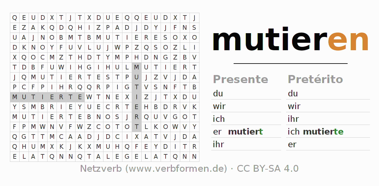 Com o caça-palavras aprende-se de uma forma desafiadora a conjugação do verbo mutieren.