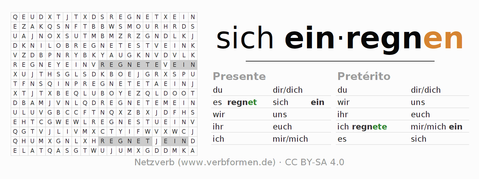 Com o caça-palavras aprende-se de uma forma desafiadora a conjugação do verbo sich einregnen.