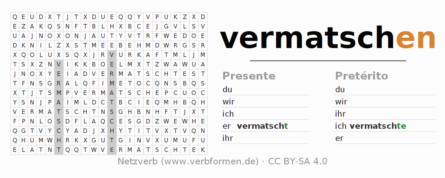 Com o caça-palavras aprende-se de uma forma desafiadora a conjugação do verbo vermatschen.