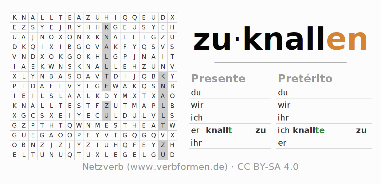 Com o caça-palavras aprende-se de uma forma desafiadora a conjugação do verbo zuknallen.
