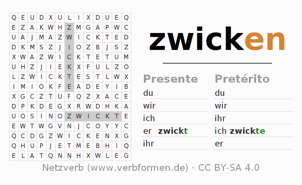 Com o caça-palavras aprende-se de uma forma desafiadora a conjugação do verbo zwicken.