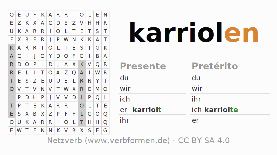 Com o caça-palavras aprende-se de uma forma desafiadora a conjugação do verbo karriolen.