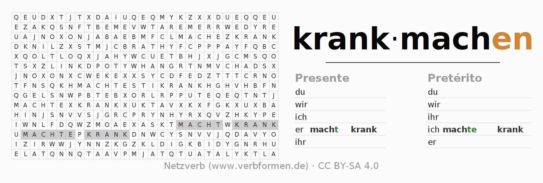 Caça-palavras para todas as formas do verbo krankmachen