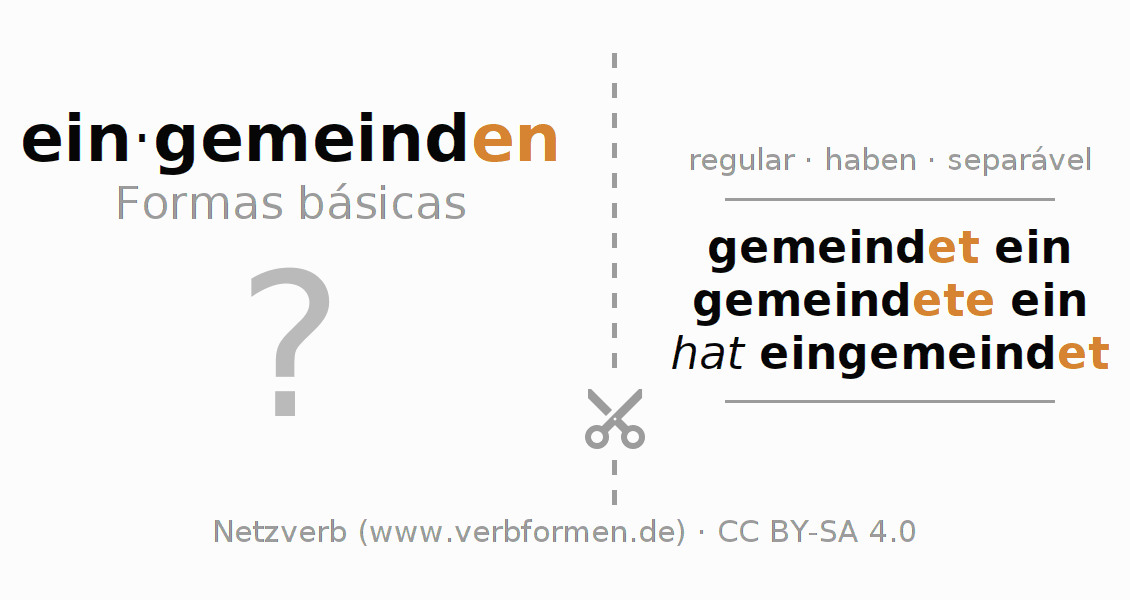 Instruções: Imprimir e recortar os flashcards do verbo eingemeinden. Em seguida, misture os diversos cartões. Retire um deles. As informações devem ser memorizadas. Para verificar a resposta utilize as informações nas fichas de aprendizagem.