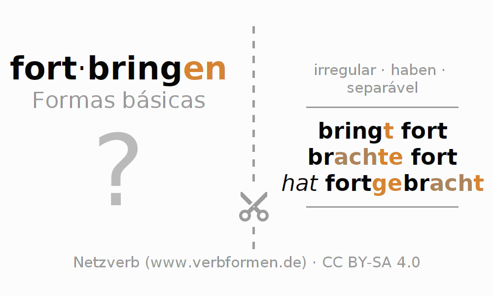 Instruções: Imprimir e recortar os flashcards do verbo fortbringen. Em seguida, misture os diversos cartões. Retire um deles. As informações devem ser memorizadas. Para verificar a resposta utilize as informações nas fichas de aprendizagem.