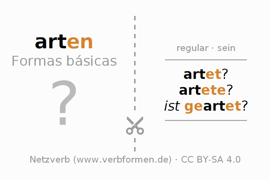 Com os flashcards, a conjugação dos verbos em alemão pode-se aprender e treinar. Para fazer isso, siga as tarefas nas folhas de aprendizado do verbo arten. As formas verbais devem ser resolvidas de cabeça. Posteriormente são comparadas com as informações nos cartões. Se concordar, você confirma seu resultado de aprendizado. Se houver um erro, você deve utilizar as informações para memorizar os cartões desconhecidos. Normalmente, imprima o arquivo em PDF dos cartões de aprendizagem e dobre-os conforme especificado. Poderá então colocá-los em uma pilha com outros verbos que deseja aprender. Há também muitas outras planilhas planilhas para o verbo arten. Todo o material está disponível nos Recursos Educacionais Abertos (OER) sob licença CC BY-SA 4.0 e pode ser usado gratuitamente.