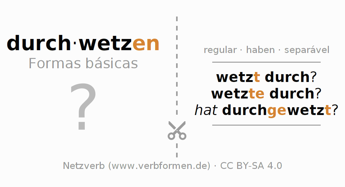 Instruções: Imprimir e recortar os flashcards do verbo durchwetzen. Em seguida, misture os diversos cartões. Retire um deles. As informações devem ser memorizadas. Para verificar a resposta utilize as informações nas fichas de aprendizagem.