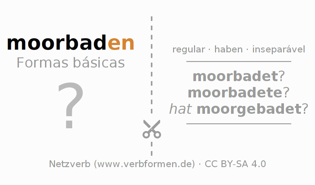 Instruções: Imprimir e recortar os flashcards do verbo moorbaden. Em seguida, misture os diversos cartões. Retire um deles. As informações devem ser memorizadas. Para verificar a resposta utilize as informações nas fichas de aprendizagem.