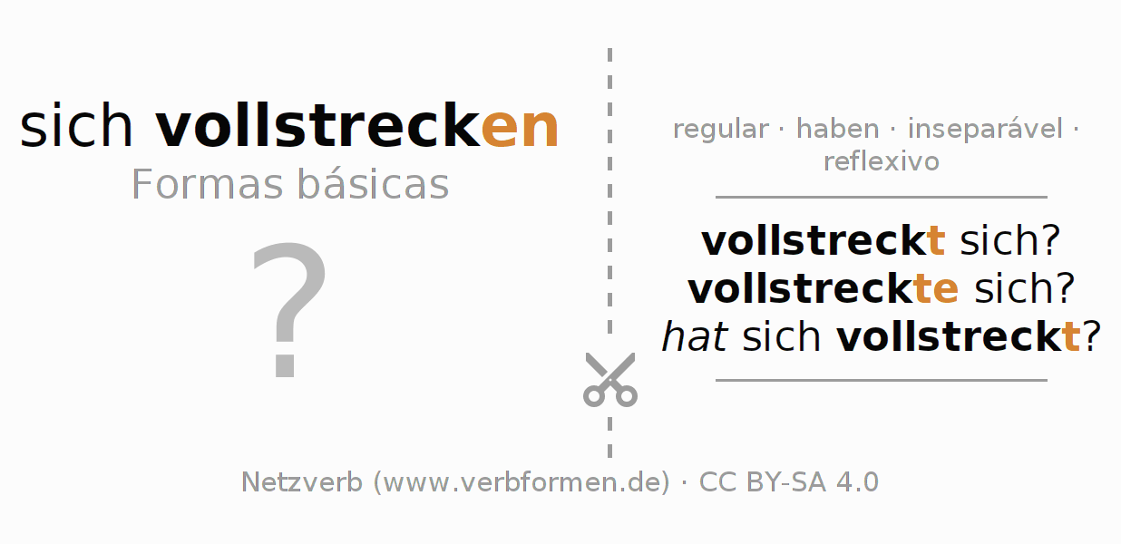 Instruções: Imprimir e recortar os flashcards do verbo sich vollstrecken. Em seguida, misture os diversos cartões. Retire um deles. As informações devem ser memorizadas. Para verificar a resposta utilize as informações nas fichas de aprendizagem.