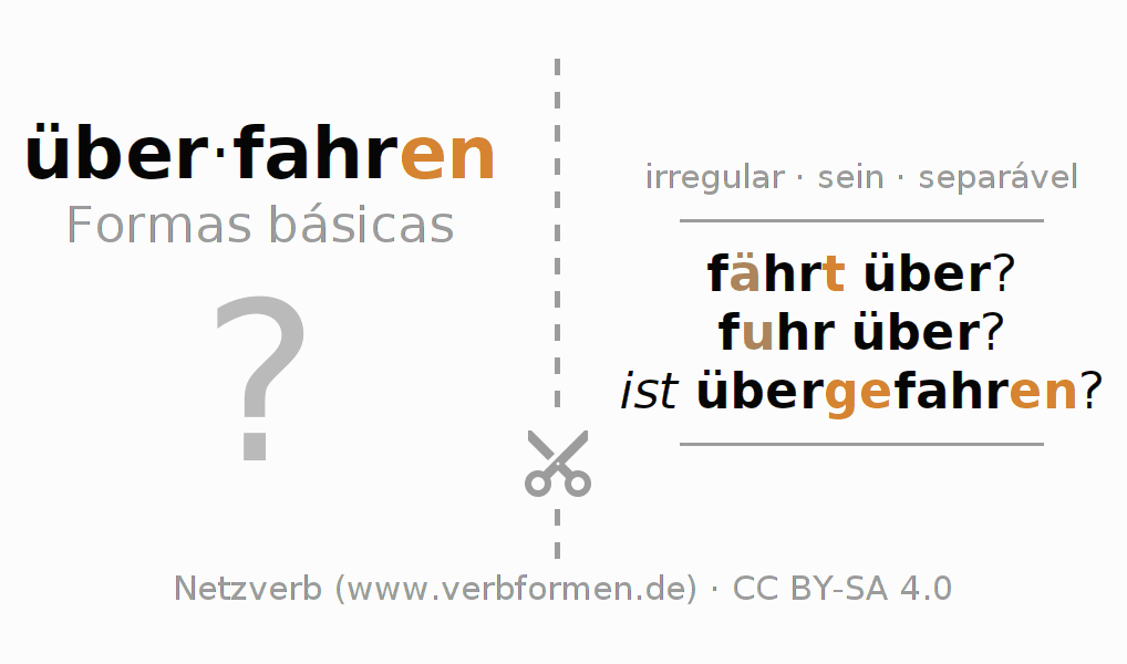 Instruções: Imprimir e recortar os flashcards do verbo überfahren. Em seguida, misture os diversos cartões. Retire um deles. As informações devem ser memorizadas. Para verificar a resposta utilize as informações nas fichas de aprendizagem.